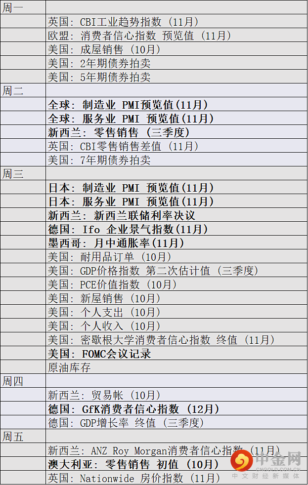 本周对很多交易者来说是缩短的一周,但并不意味着没有经济数据。周二市场将迎来11月制造业与服务业PMI第一次读数、新西兰三季度零售销售。周三美国将在为期两天的假期(美国市场周五交易半天,但速度很可能放慢)到来之前揭晓大量数据,其中重点有耐用品订单、个人支出与个人收入、核心PCE以及三季度GDP第二次估计值。另外,美东时间下午2:00,美联储将公布上次FOMC会议的记录。本周其它将要公布的经济数据如下: