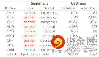 美元多头头寸总额连续第六周下降,兑美元汇率上升 5.54 亿美元,使整体头寸增至 185 亿美元,较我们研究的货币 10 月初的峰值 232 亿美元下降了约 20%。尽管如此,在截至周二的一周内,美元兑所有主要货币均升值,欧元下跌 2.4%(本报告中表现最差的货币)至 1.14 以下并最终跌至 1.13。在前一周转为小幅多头后,欧元情绪再次转为看跌,兑欧元汇率下跌 11 亿美元,将其整体头寸设置为 5.41 亿美元空头,这仍远低于六周前 220 亿美元的总空头头寸。