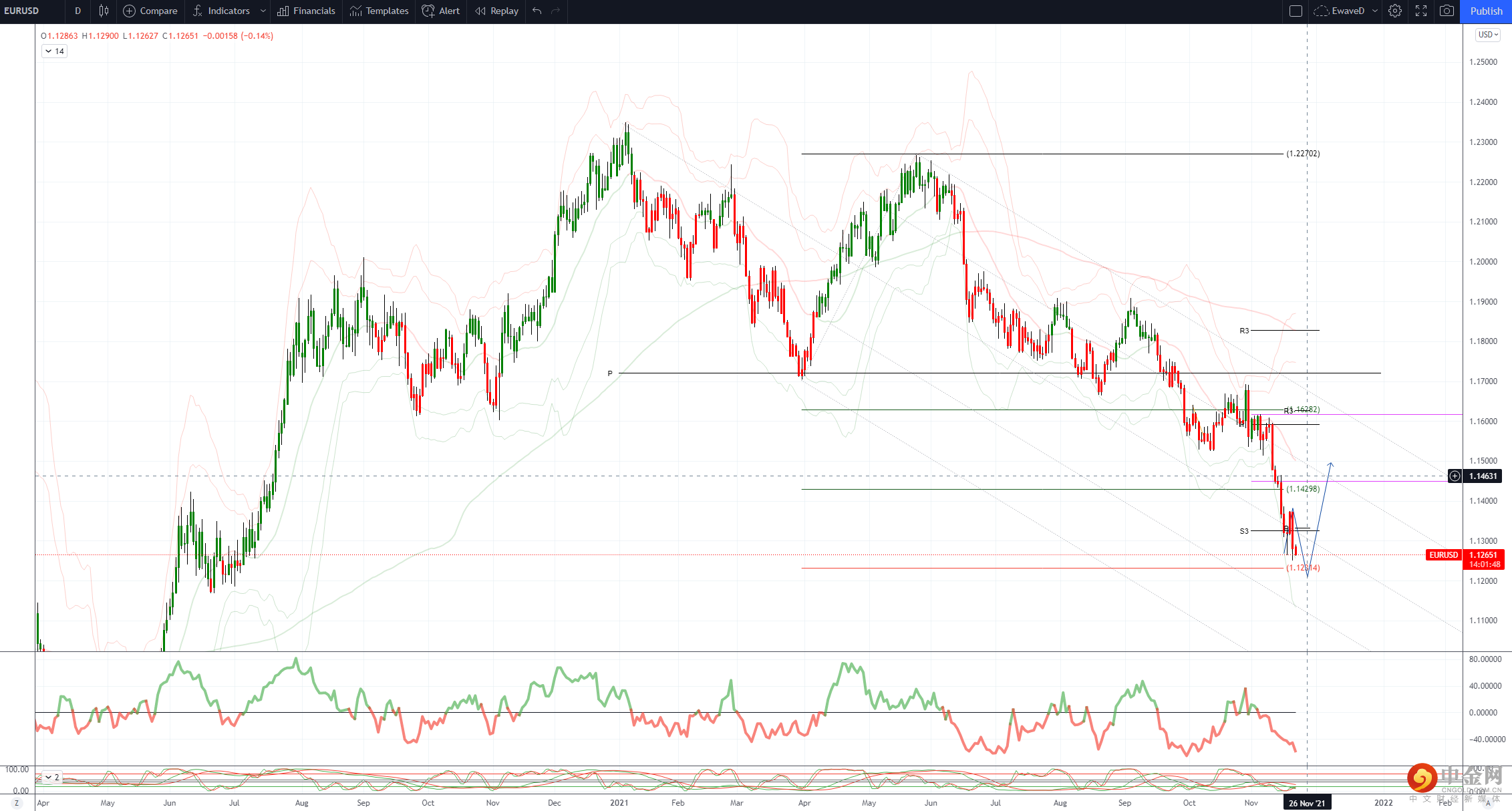 跌破 1.1250 的目标是 2020/2021 年 76.4 的 1.1040