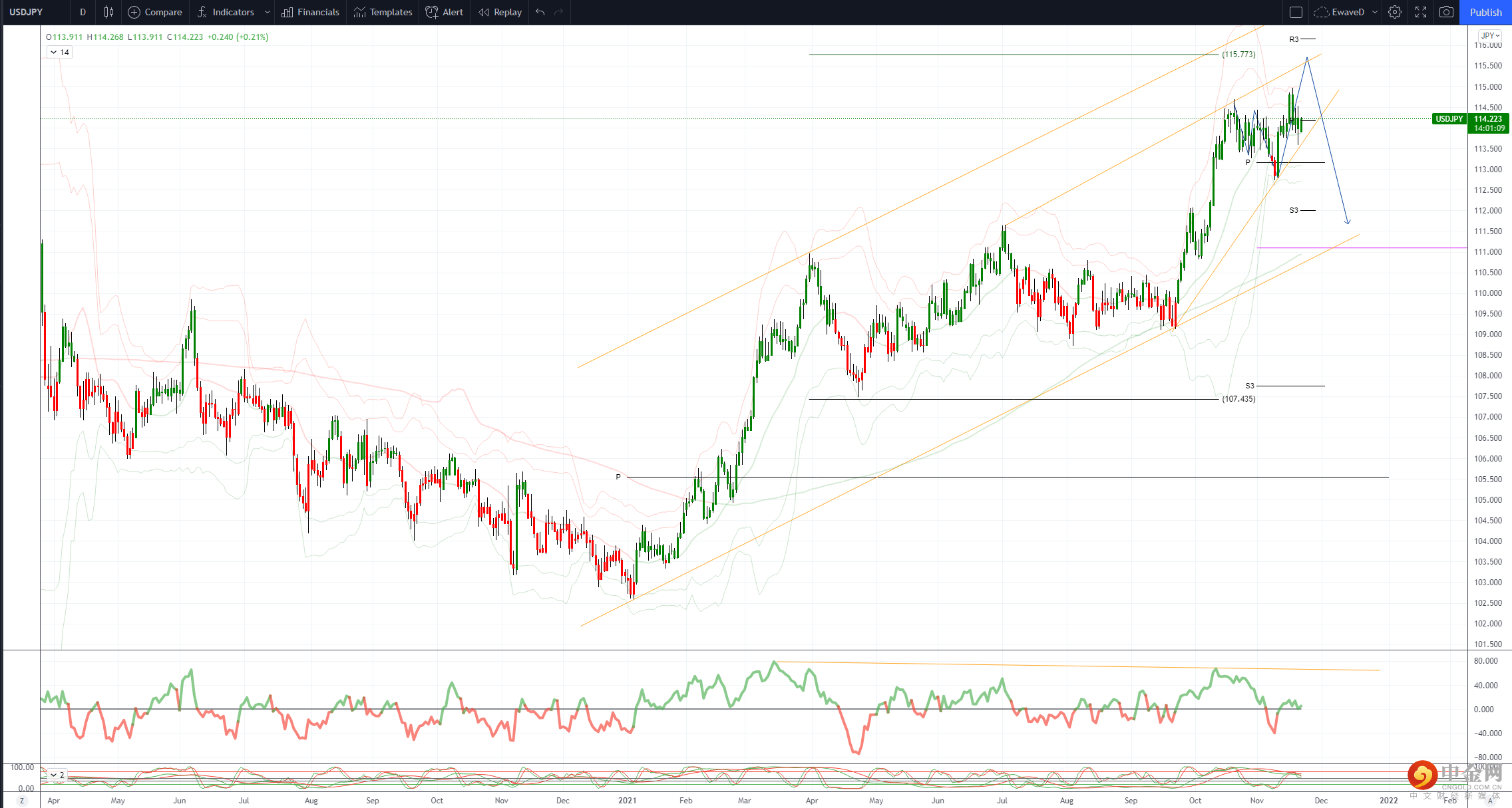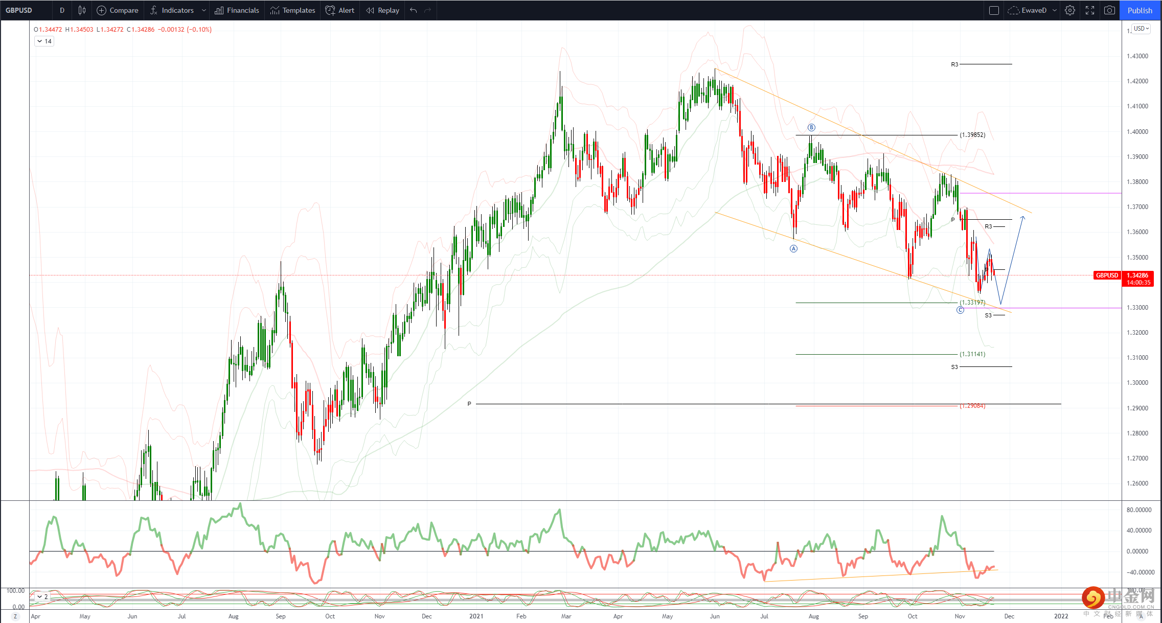 目标是突破 11 月低点 1.3354 并测试 1.3166,2020-21 年上涨 38.2%
