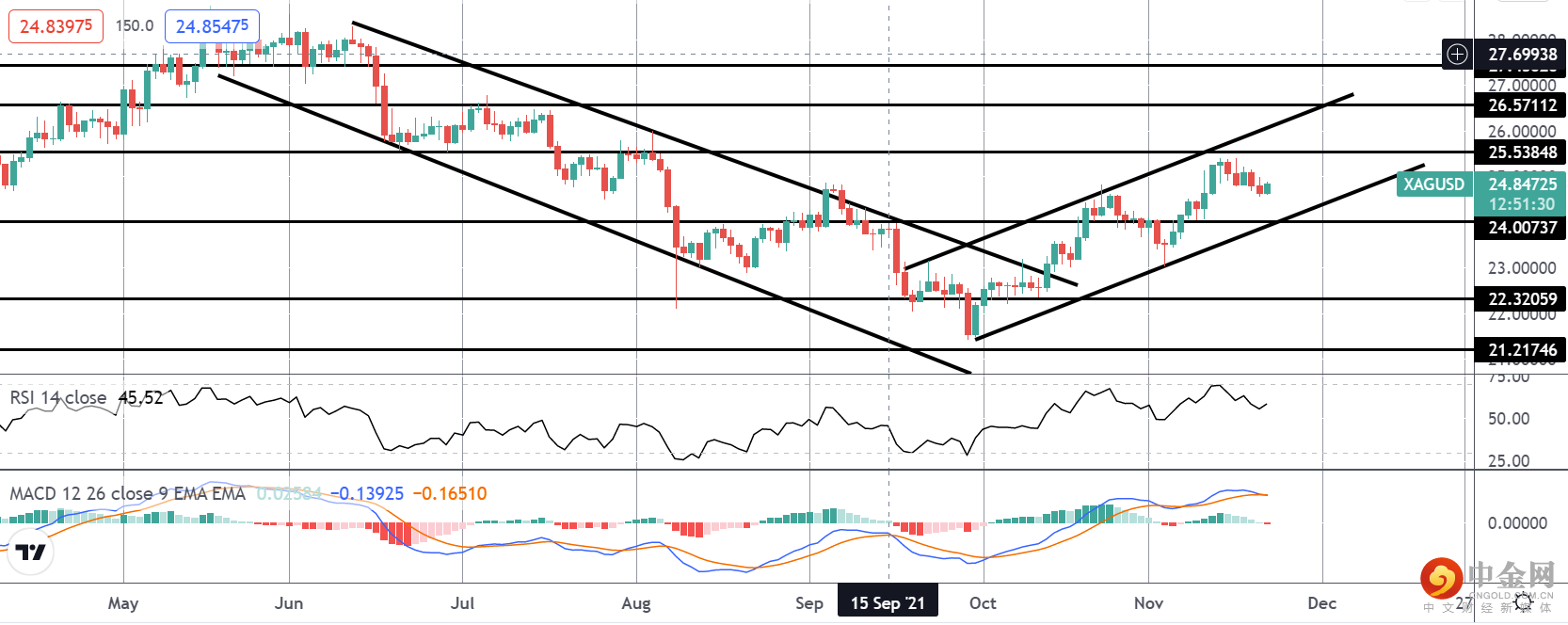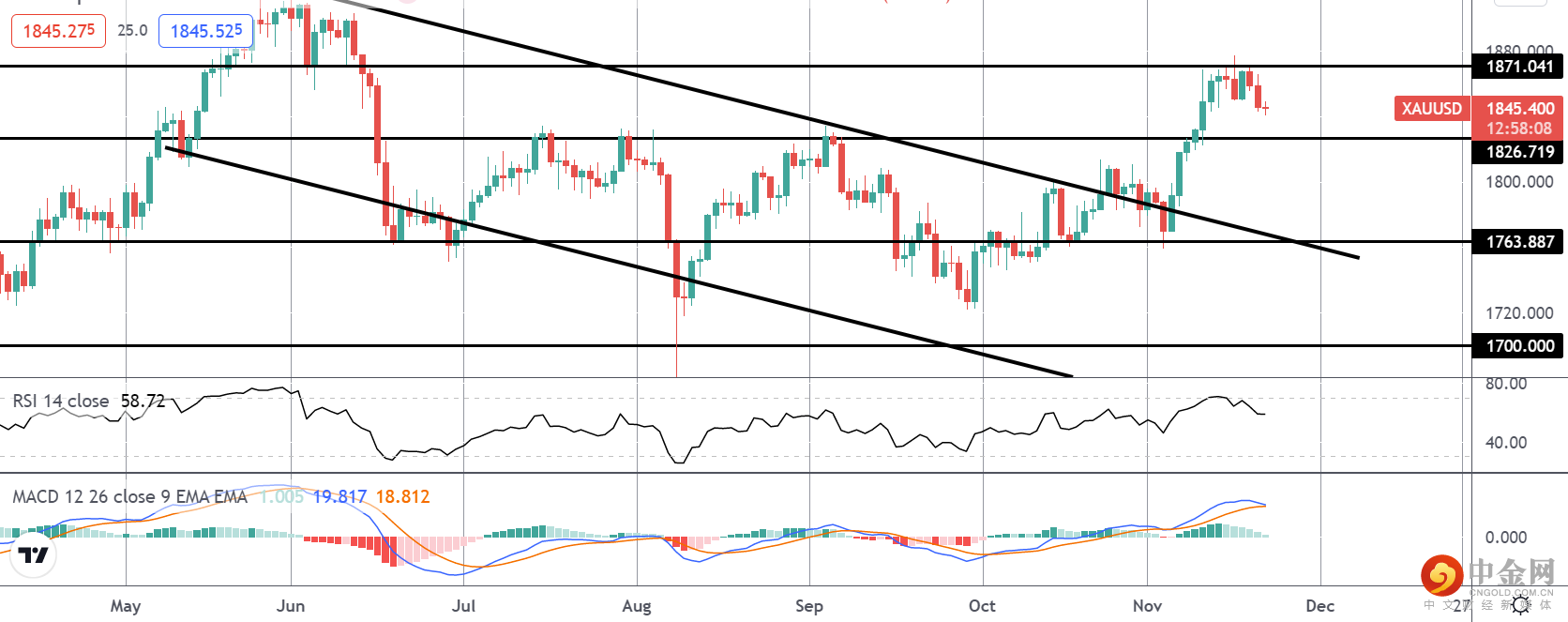 黄金在熊市通道上方的突破使价格交易高达 1871.04 水平。目前,市场在这里暂停,卖家将价格从该水平转低。然而,RSI 和 MACD 仍然看涨,而价格仍高于 1826.71 水平,焦点是短期内进一步上涨。