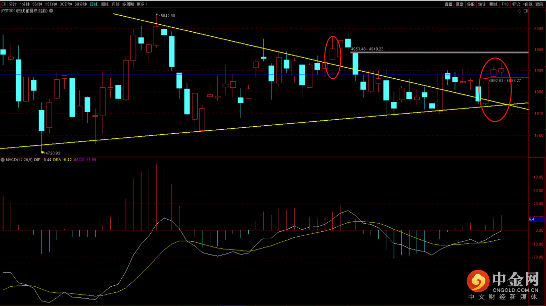 沪深300短期依旧没有突破4915点,后续行情重点关注4915点的突破与否,由于目前出现了多次五分钟顶背驰结构,后续如果迟迟不出调整大概率会有一根大阴修正,但由于趋势向上在回调后大概率会出现再次的回升。