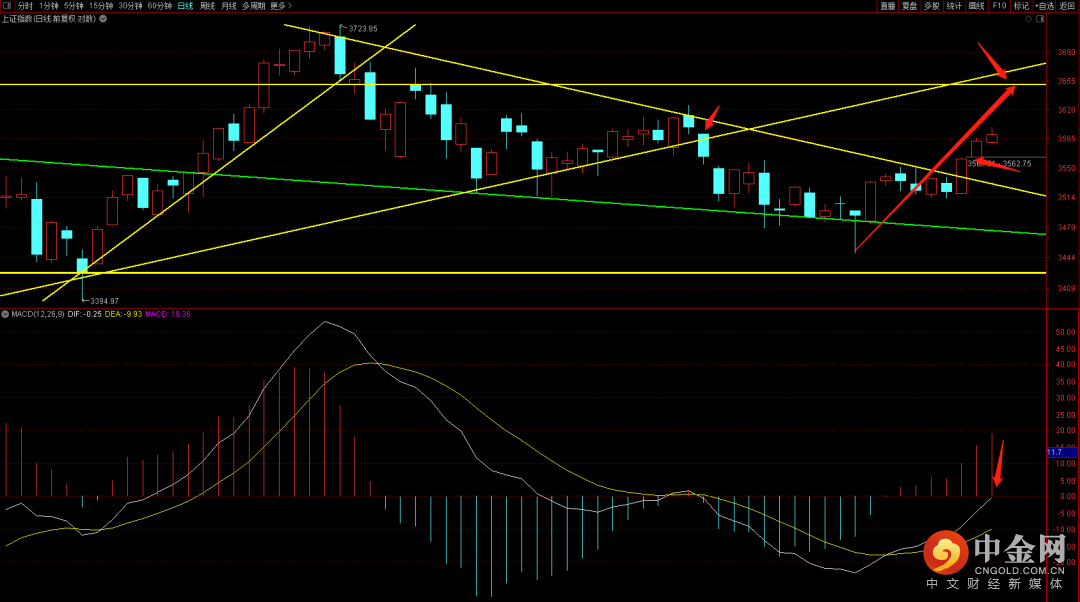 大盘连续三天放量向上,短期上方前期的跳空缺口已经回补完毕,短期需要开始谨慎这周的跳空缺口,如果这段时间出现连续背驰向上则后续下跌的力度就会变强,关注下方3520到3550的支撑,而上方极限压制大概率会出现在3615到3645附近。