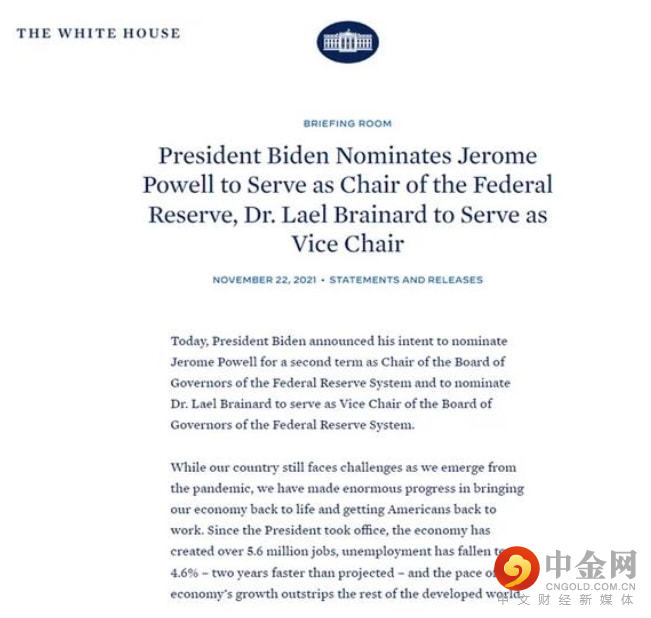 周一美国总统拜登宣布提名鲍威尔连任美联储主席,同时布雷纳担任副主席。俩位联储主席都再次调遏制通胀是美联储的其首要任务。市场预计鲍威尔+布雷纳的组合有助于美联储的政策连贯性,而且在发布会上俩人暗示美联储将继续走紧缩路线,甚至不排除加息,这种高层的连贯性和一致性在中期将利空黄金。所以在白宫宣布美国总统拜登提名杰罗姆·鲍威尔连任美联储主席,并任命美联储理事莱尔·布雷纳德担任美联储副主席后股市创下新高,黄金大跌创三个多月以来最大日跌幅。