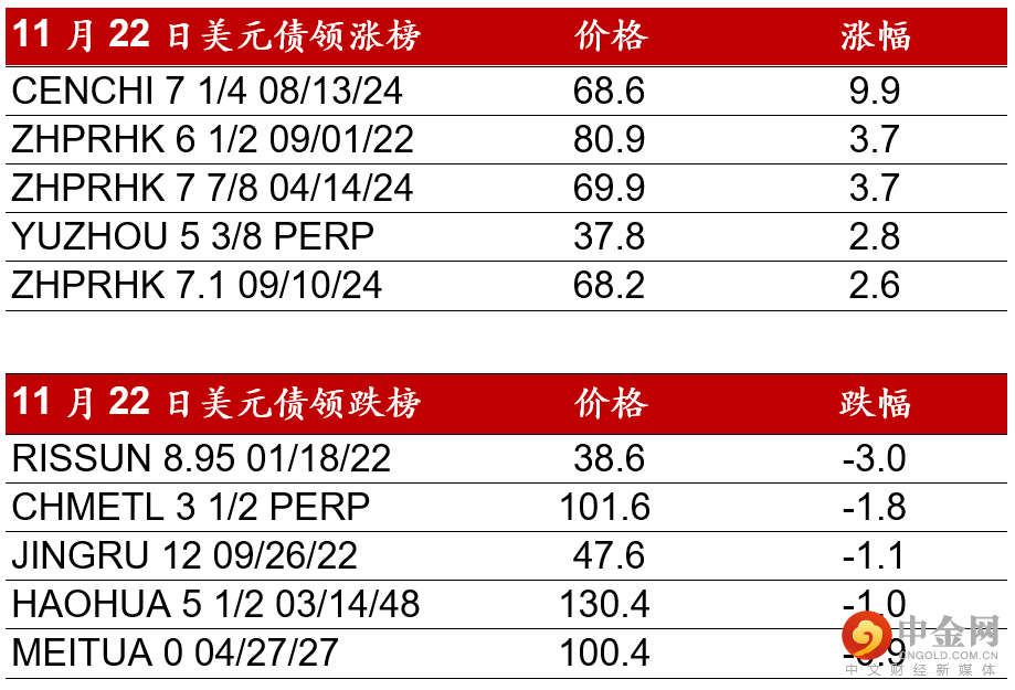 昨日(11月22日),中国高收益债券市场相较稳定,部分债券在较多买盘推动下有见较好涨幅。在公司与中原银行达成100亿元人民币战略合作消息的推动下,建业有见较多买盘,上涨约5-8pts。正荣上涨约1-4pts,22年到期债券价格回升至80水平以上。奥园在ABS延期计划通过后回稳约2-3pts,但随后回落至上个交易日收盘水平。佳兆业有见较多卖盘,下跌约1-1.5pt。其他评级较好债券如龙光/旭辉等也上涨约0.5-1pts。
