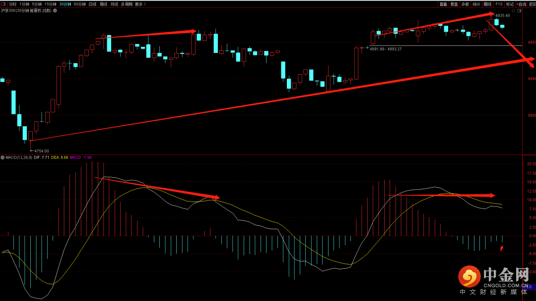 沪深300三十分钟出现顶背驰结构,短期这个位置如果不出现调整继续上冲后续大概率会出现更大幅度的调整。关注上升趋势线的支撑。