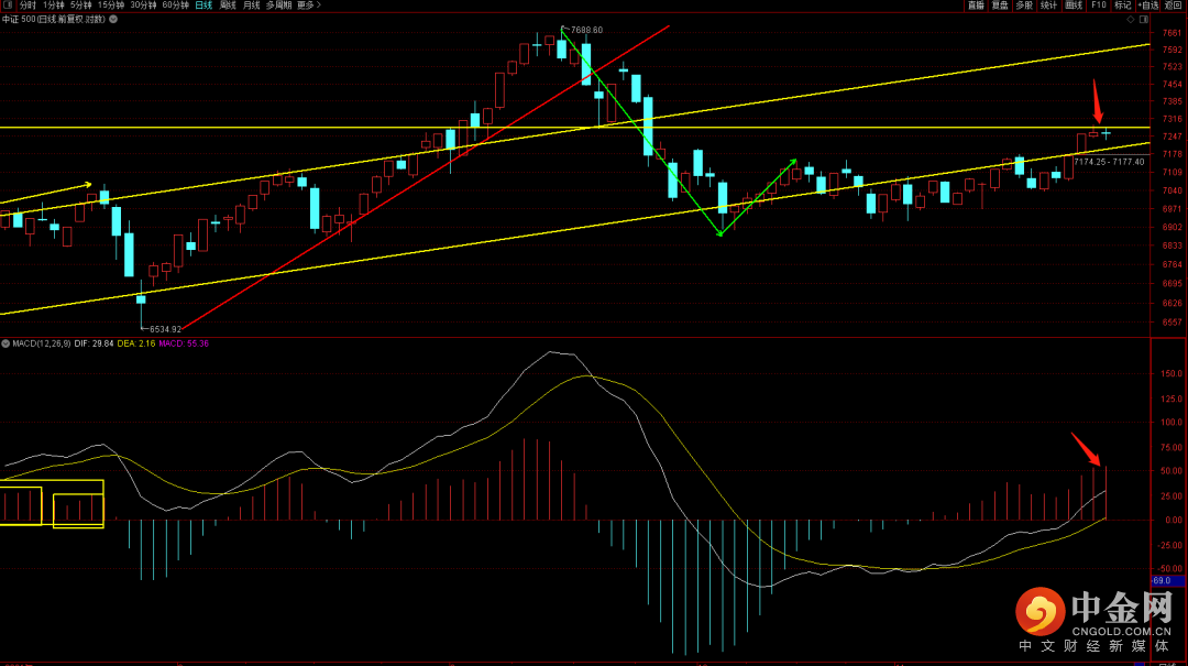 中证500短期关注前期中位线压制,在没有突破之前大概率不会有大的行情出现,关注回踩力度。如果没有出现再次跌破上升趋势线下轨则有望再次向上突破。