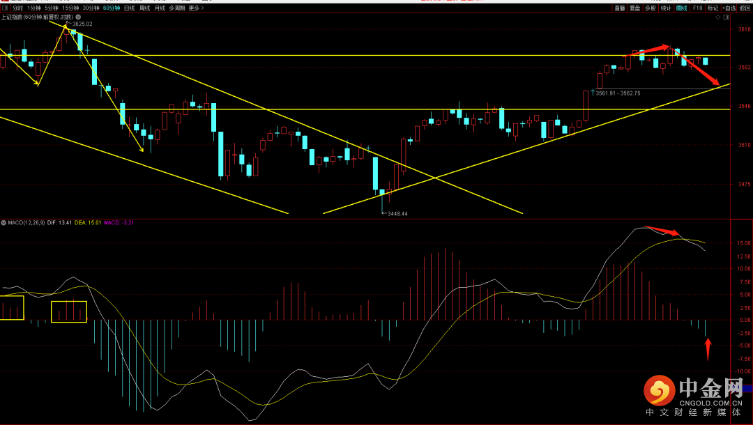 大盘出现缩量调整结构,短期由于六十分钟macd刚刚翻出绿柱后续调整还会继续延续,短期如果出现再次的冲高大概率需要进行减仓操作。下方需要关注六十分钟的上升趋势线支撑。如果出现跌破可能会出现探下降趋势线支撑的可能存在。