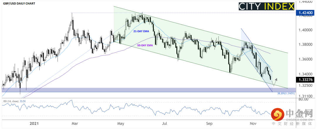 英镑/美元阻力最小的方向仍然是持续下跌,但14天RSI与价格背离暗示抛压可能在减退,所以至少在本周结束前、美国假期期间有反弹的机会。不过,只要受制于1.3400一线中轨的阻力,交易者就可能将任何短线回升视为沽出机会。