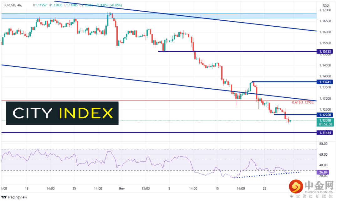 结合美联储官员们近期的强硬评论,以及偏强硬的FOMC 11月3日会议的记录,欧元/美元走低也在情理之中。毕竟,欧洲央行的很多评论截然相反。欧元/美元4小时图最近击穿了2020年3月低点到2021年1月高点行情的61.8%回档位,攻克了5月底以来的下降通道的下轨趋势线,接下来的目标在遥远的3月30日高点1.1145引出的水平支撑位。但请注意,欧元/美元价格目前与RSI背离,表明价格有准备回升的可能性。在周四和周五流动性不足的美国市场,这种可能性显得尤其真实。水平阻力位在1.2260,然后是前述通道的下降趋势线,即1.1300附近,接着是11月18日高点1.1374。