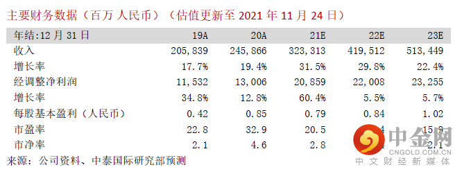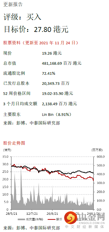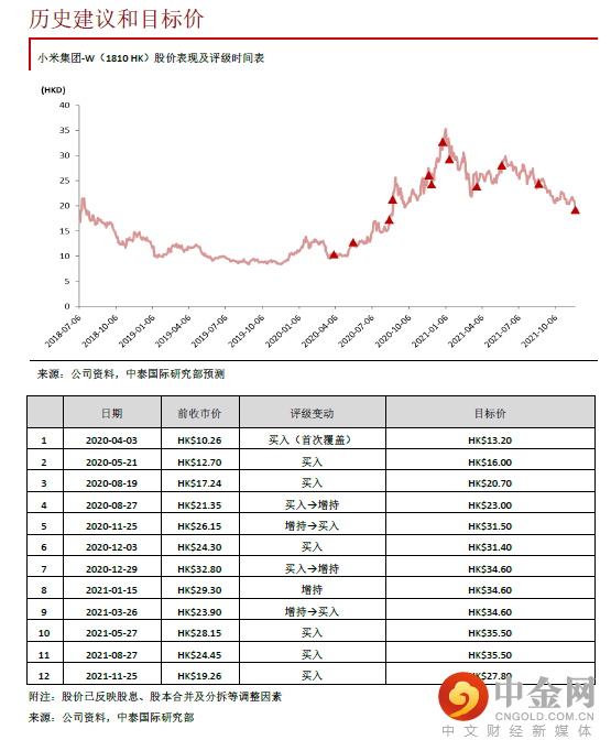我们调整了盈利预测,以综合反映芯片供应紧缺将延至明年、IoT与生活消费品销售增速放缓、高端产品表现较好带动智能手机ASP及毛利率有较好表现等因素,预期21/22/23年EPS分别为0.79/0.84/1.02元。维持28倍22E PE估值,相应下调目标价至27.80港元,潜在升幅44%,重申“买入”评级。