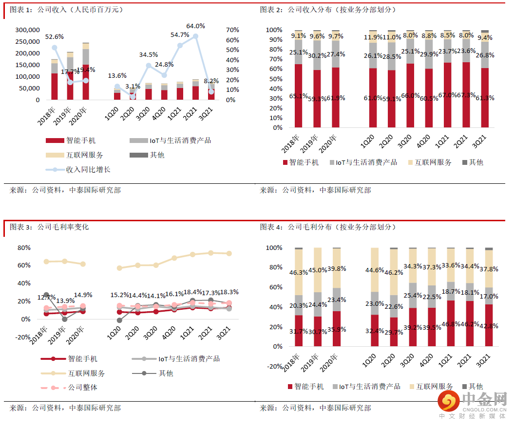 互联网服务业务收入同比增长27.1%,增速继续加快,环比增长4.3%;其中,境外互联网服务收入同比增长110.0%至15亿元,在整体互联网收入中的占比进一步提升至19.9%。2021年9月全球MIUI与活跃用户数同比增长32.0%至4.9亿。广告为互联网业务主要收入来源(约占65%),同比大幅增长44.7%,环比增长6.7%。受到政策变化及宏观影响,3Q21广告行业参与者收入增速普遍下滑,但公司广告业务仍然向好,并连续三个季度同比增速超40%。中国游戏行业监管升级下,公司游戏业务同比及环比分别实现25.0%及11.1%的高增长。我们认为公司互联网服务表现亮眼,一方面得益于全球化布局,另一方面也印证了手机销售强劲可带动用户规模扩张,高端产品占比增加有助ARPU提升的逻辑。考虑到3Q21手机销量下滑、广告行业偏软、季节性等因素,我们对4Q21互联网服务收入较为审慎,但对其发展趋势保持乐观。
