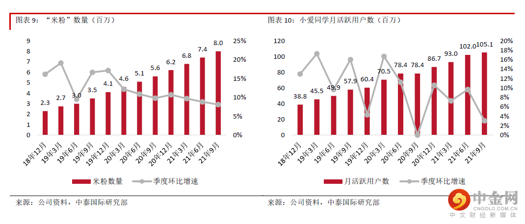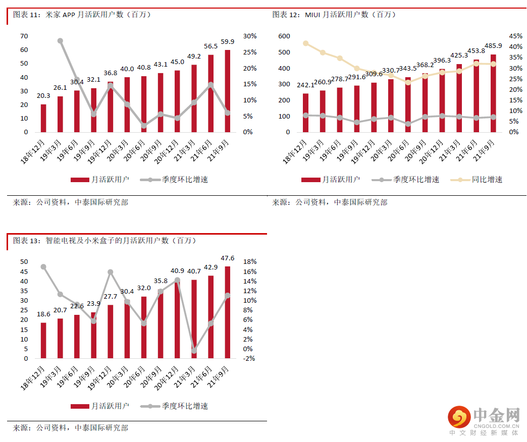 3Q21 IoT与生活消费产品收入同比增长15.5%,增速放缓,主要由于受到境外海运物流等因素影响,但境外IoT及生活消费产品收入仍创单季新高。我们重点关注的IoT相关经营数据持续向好,IoT平台已连接设备数(不含智能手机及笔记本电脑)已达4亿台,同比及环比分别增长33.1%及6.8%;米家APP月活跃用户数增至5,990万,同比增长39.0%,增速加快,环比增长6.0%;人工智能助理“小爱同学”月活跃用户数首度超过1亿,同比增长34.1%,增速加快,环比增长3%。公司持续发布具强连接性的产品。拓宽产品组合有助提升用户IoT场景体验,增强用户基础,形成良性循环。