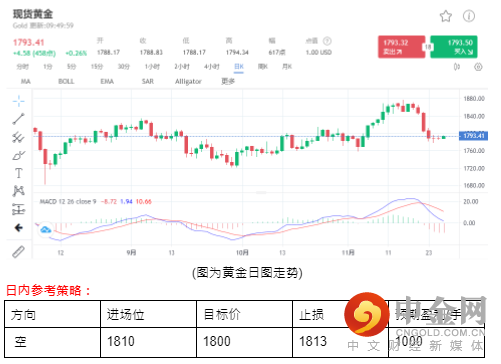 美国感恩节假期,经济数据也提前一个交易日公布,整体市场表现清淡。周三公布的核心PCE 4.1%仍维持高档,预期通胀也出现反弹,黄金在本周跌近100元下两天守住低点;市场预期12月美联储口径转鹰,加速缩减购债,最鸽派的旧金山联储戴莉24日提到每月1200亿美元购债鹰加速退场,导致2年期国债本周目前大涨超过20%,冲高至0.616;黄金虽在通胀背景下,仍不敌加速购债制衡。