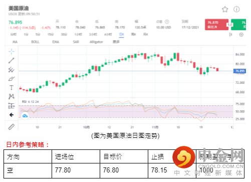 日线观察,原油前一个交易日价格在79箱型整理跌破颈线附近转弱,上方压力仍强;操作上以区间75-79来观察,反弹79布空单。