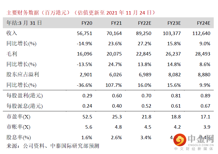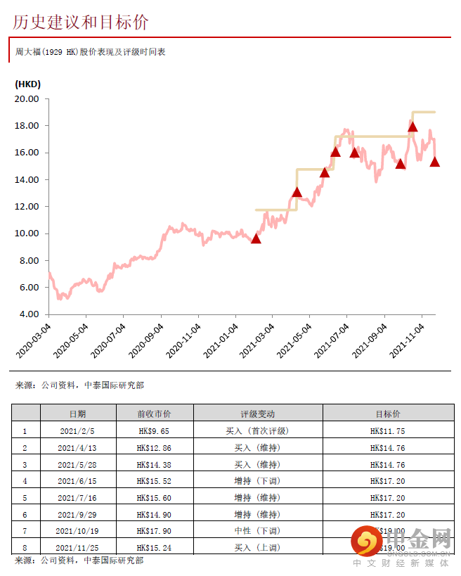 我们维持盈利预测不变,预测22-24财年收入分别为892.5亿/1,033.8亿/1126.4亿港元,同比上涨27.2%/15.8%/9.0%;预测每股盈利分别为0.7/0.81/0.89港元,同比增加16.0%/15.6%/9.9%。我们维持19.00港元的目标价,对应23财年23.5倍PE。公司股价在业绩公布翌日下跌10.46%,估计是因为投资者意现在才识到下半年内地同店销售增长放缓而抛售,然而目前股价较我们10月19日给予中性评级当天起已最多累计下跌18.8%,而且对应23财年PE回落至17.9倍,贴近历史均值,风险回报比渐现吸引,因此把评级从“中性”上调至“买入”。我们认为周大福在渠道扩张、供应链管理、品牌影响力及科技应用等均领先内地及香港主要同业,有信心公司可达成25财年7,000家门店的目标,有助抢占内地更多市场份额。
