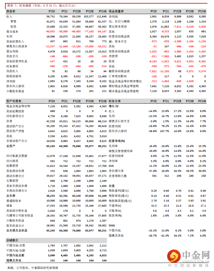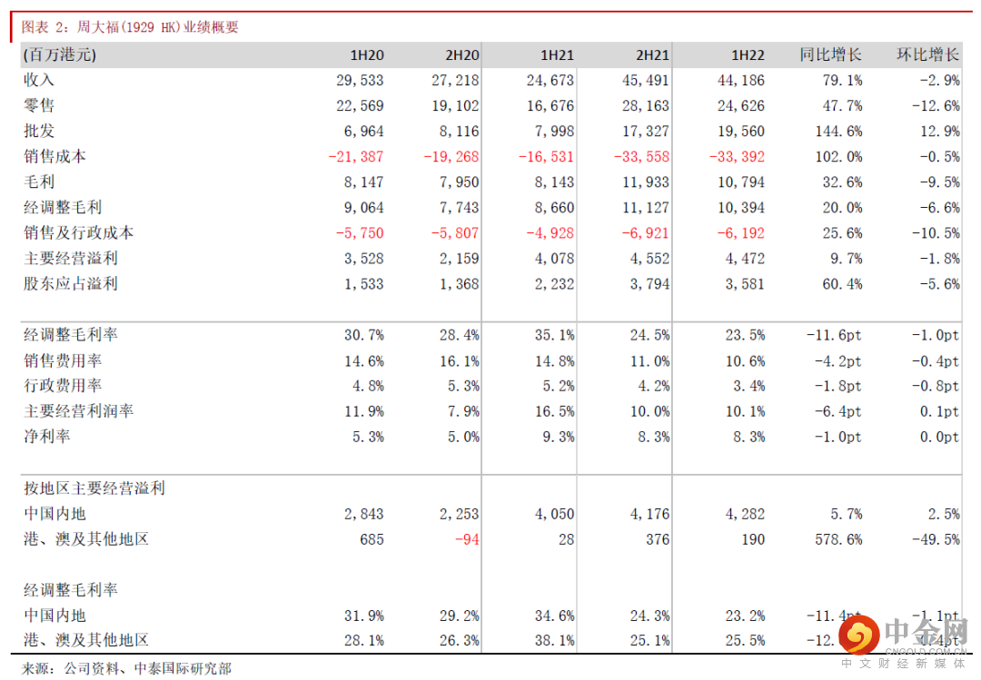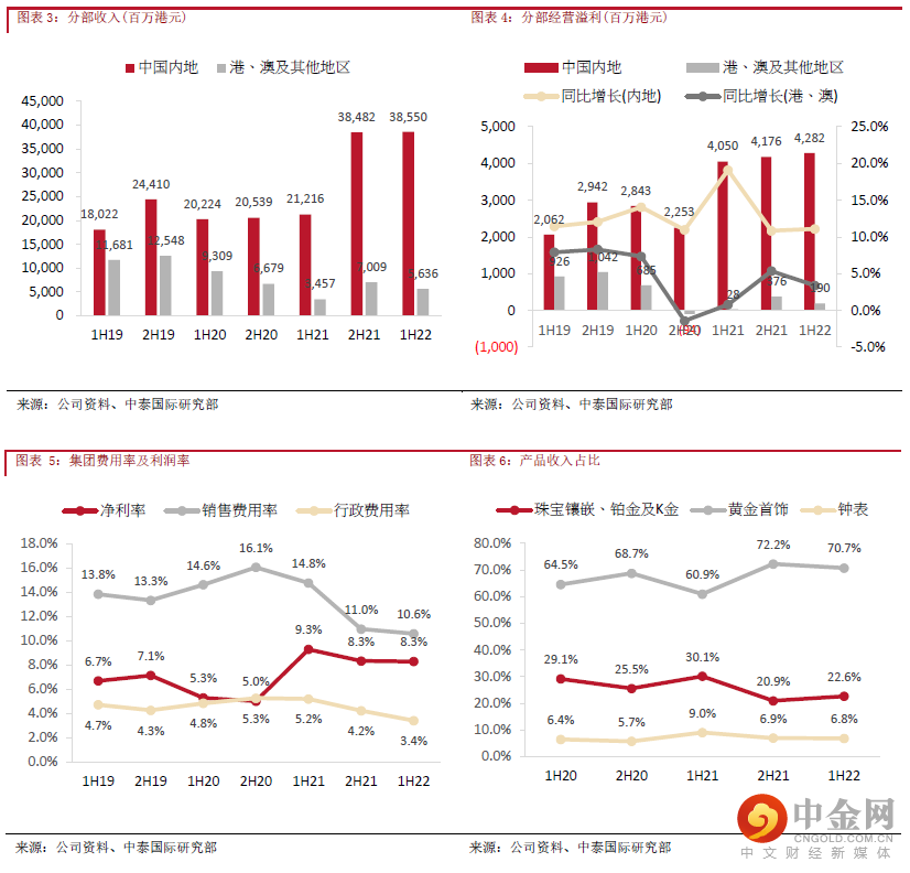1H22财年集团经调整毛利率同比减少11.6个百分点至23.5%,主因:1) 去年国际金价急升以致较高基数;2) 较低毛利率的黄金产品销售占比上升;3) 低毛利率的加盟批发收入占比增加。销售费用率及行政费用率分别同比下降4.2及1.8个百分点,其中专柜分成、员工成本、折旧等费用率分别同比下降0.7/2.4/2.4个百分点。得益于更有效的费用控制及内地加盟渠道的快速扩张,集团经营溢利率同比仅下跌6.4个百分点至10.1%,环比更录得0.1个百分点的提升。我们预计在通过加盟商加强内地低线城市的渗透下,公司总体经营溢利率于中长期有望恢复至12%左右。