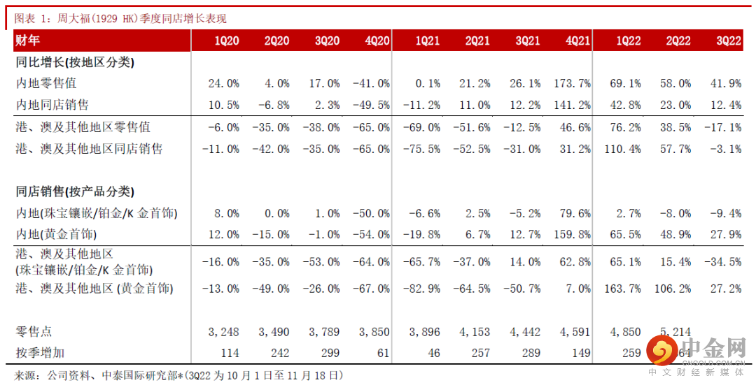 公司透露了截至10月1日至11月18日的营运数据,增速较Q2有所减慢,其中中国内地零售值同比增加41.9%,同店销售同比上升12.4%;港、澳地区零售值同比下跌17.1%,同店销售同比减少3.1%。按产品划分,内地珠宝镶嵌等定价首饰同店销售同比下跌9.4%;黄金首饰等产品同比增加27.9%。管理层透露下半财年受较高基数影响,同店销售将回归正常化,预计内地同店销售录高单位数下跌,但全年内地销售收入仍可保持30%-40%的增长,而港澳同店销售预计录中单位数增长。