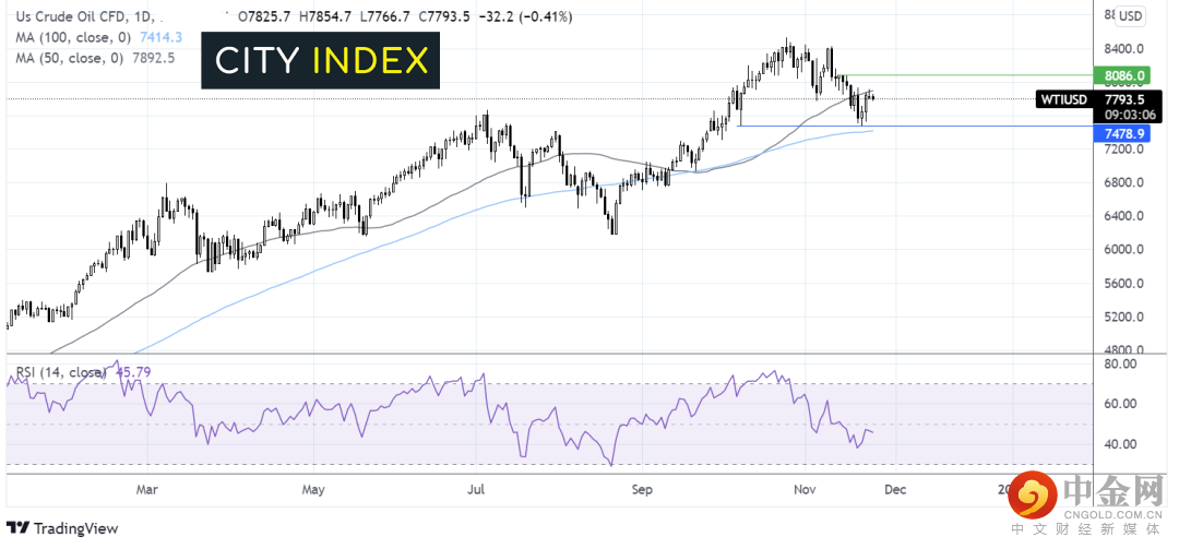 油价自72.70反弹,几乎触及100天均线,但已止步于50天均线78.83。