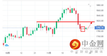 上一个交易日(11/25)黄金收跌,开盘价为1789.47,中间过程一度上涨1795.13的高点,最后收于1788.83。出现连6跌的状况,但已经连续2跟线图收出十字星。于今日(11/26)早间价格依旧挑战站稳1790关口。