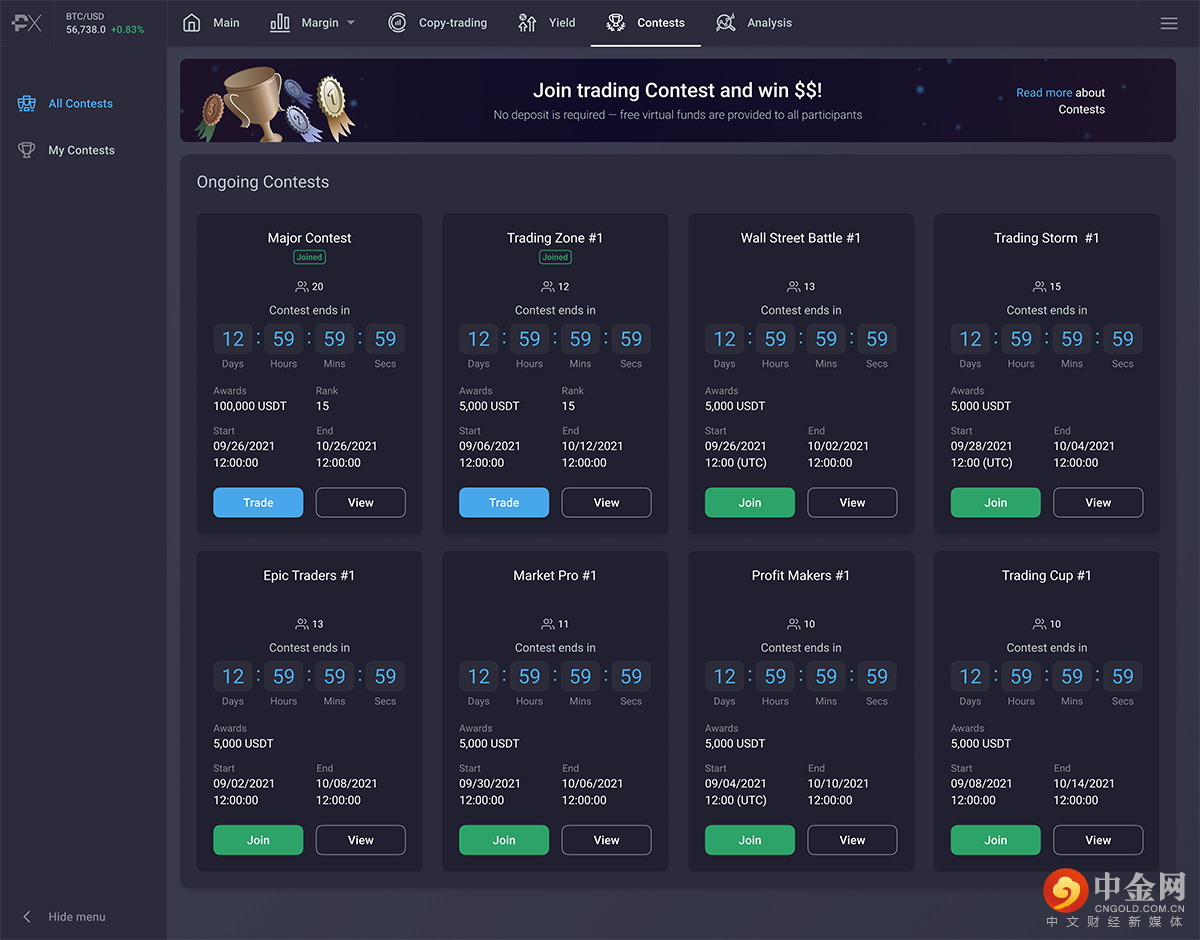 通过单击主平台菜单中的比赛,用户可以查看所有正在进行的和即将举行的比赛。为了加入比赛——您只需点击加入按钮。参加比赛不需要报名费或押金。选择特定的比赛允许用户查看获得资格和赢得奖品的必要条件。