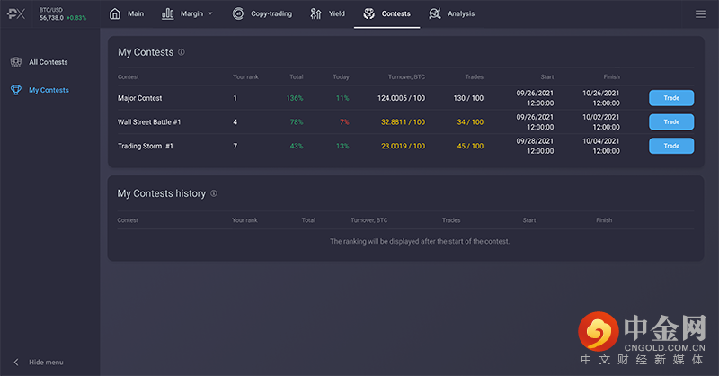在“我的比赛”选项卡中,您将找到有关您参加的比赛的信息。在这里你可以看到你在比赛中的排名、你的营业额和交易等。