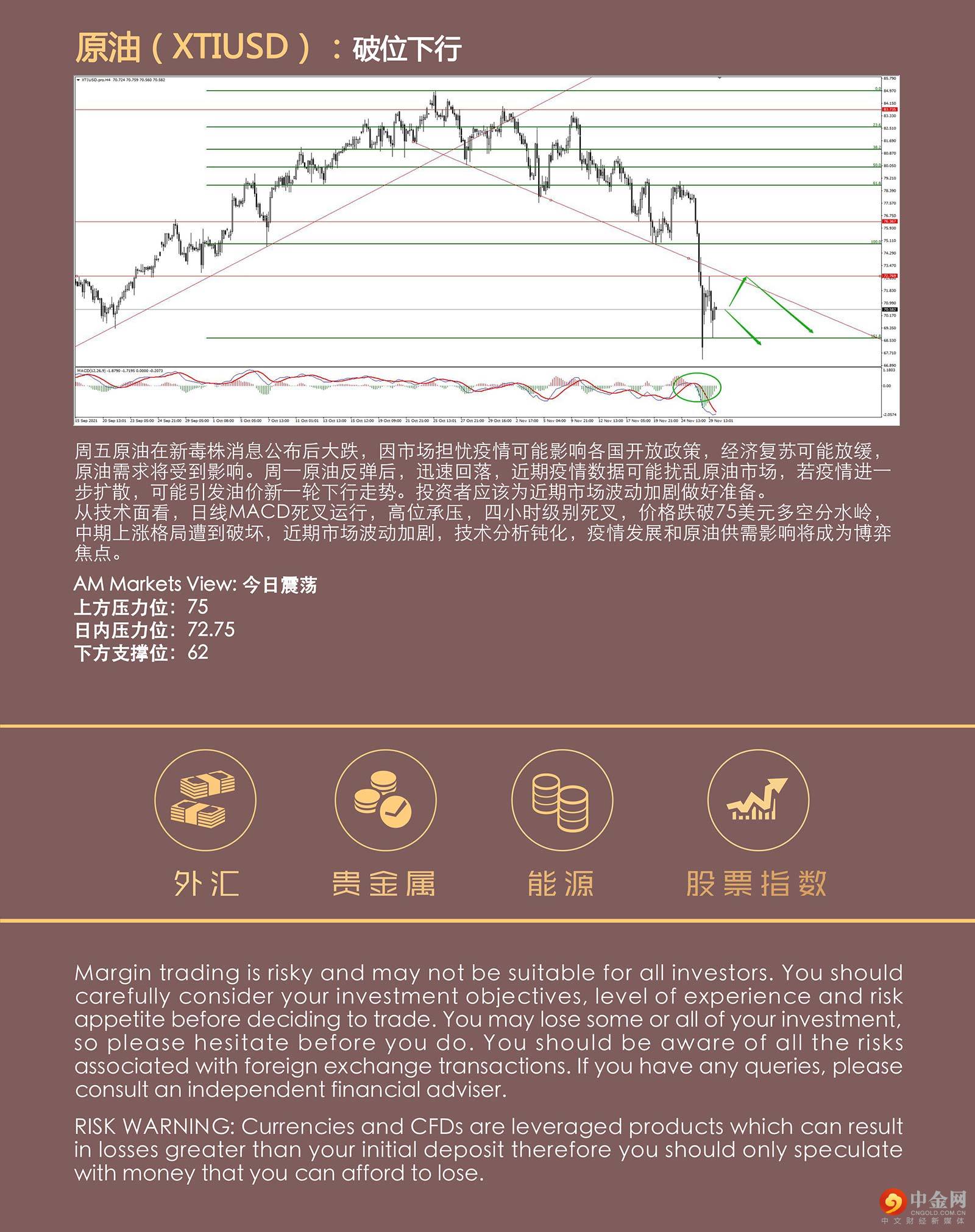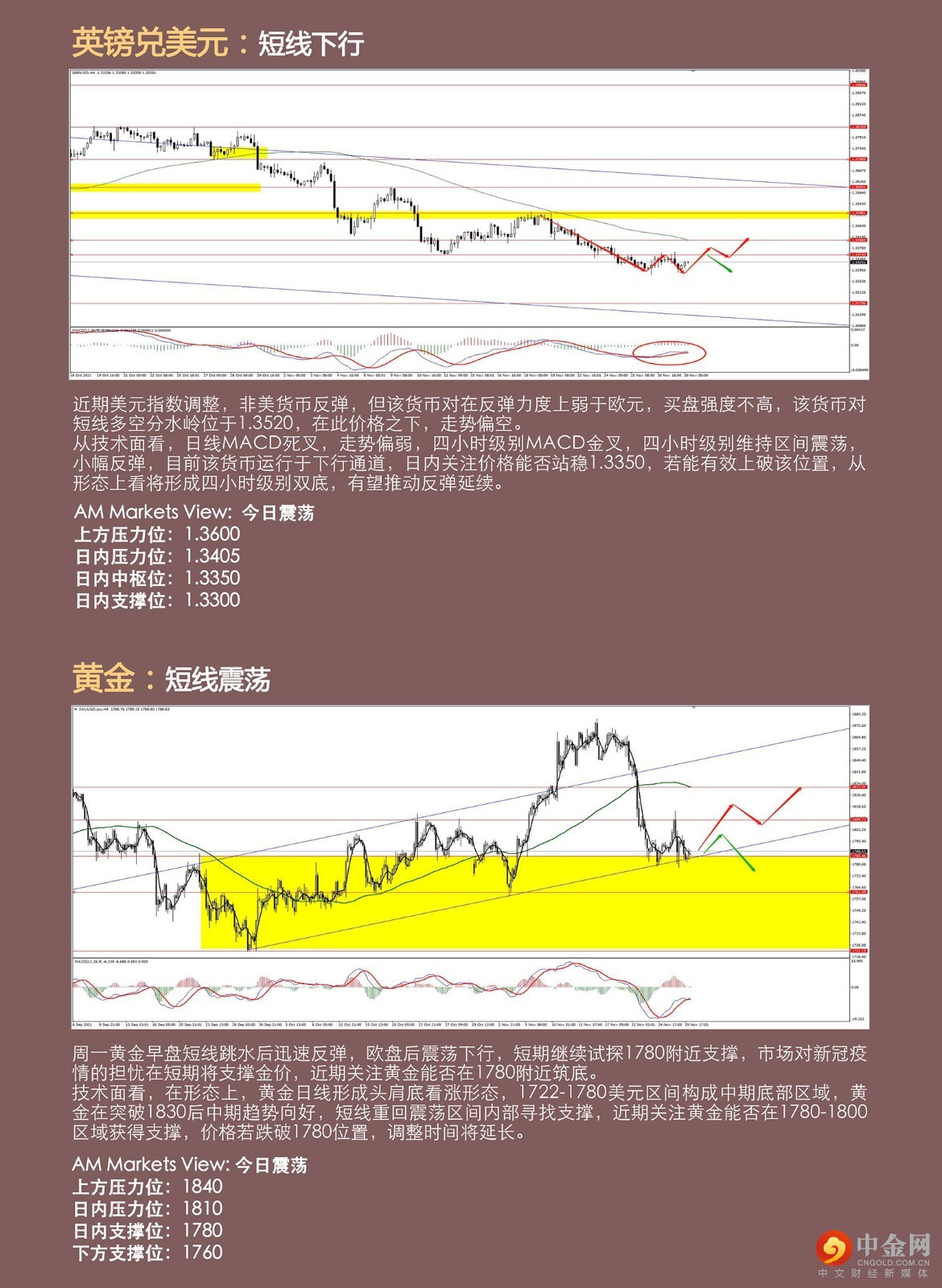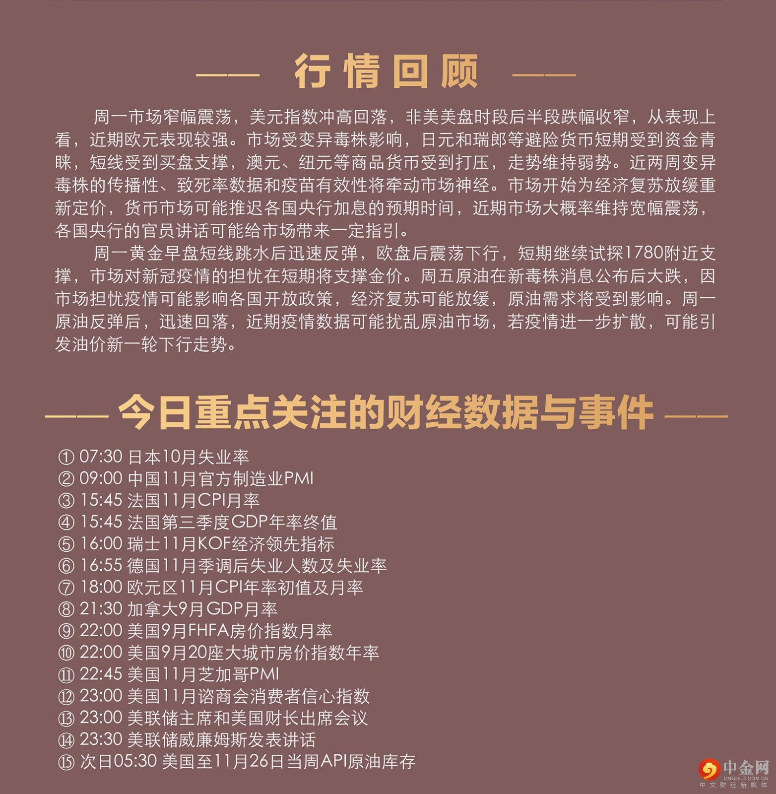 周一市场窄幅震荡,美元指数冲高回落,非美美盘时段后半段跌幅收窄,从表现上看,近期欧元表现较强。市场受变异毒株影响,日元和瑞郎等避险货币短期受到资金青睐,短线受到买盘支撑,澳元、纽元等商品货币受到打压,走势维持弱势。近两周变异毒株的传播性、致死率数据和疫苗有效性将牵动市场神经。市场开始为经济复苏放缓重新定价,货币市场可能推迟各国央行加息的预期时间,近期市场大概率维持宽幅震荡,各国央行的官员讲话可能给市场带来一定指引。 周一黄金早盘短线跳水后迅速反弹,欧盘后震荡下行,短期继续试探1780附近支撑,市场对新冠疫情的担忧在短期将支撑金价。周五原油在新毒株消息公布后大跌,因市场担忧疫情可能影响各国开放政策,经济复苏可能放缓,原油需求将受到影响。周一原油反弹后,迅速回落,近期疫情数据可能扰乱原油市场,若疫情进一步扩散,可能引发油价新一轮下行走势。