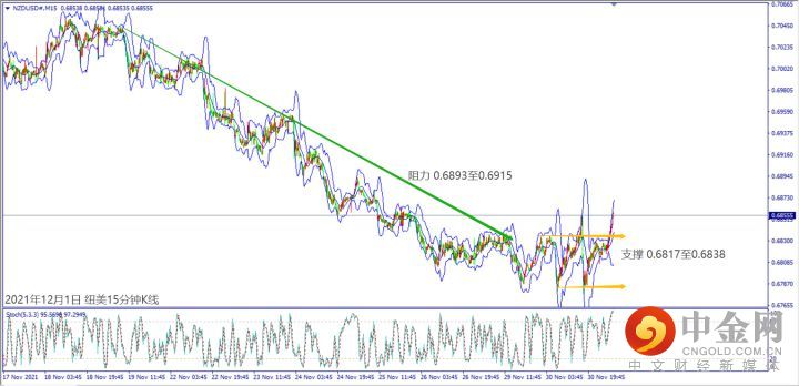 日级别线图,纺锤线阳烛创两周高点,守住5日均线,有机会挑战30日均线;15分钟K线,短线形成盘涨,上升趋势线若守稳,大有可能挑战上方阻力。