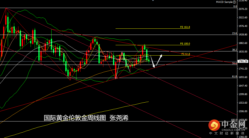 周线级别:金价本周维持承压震荡走势,走势反弹也在触及给出的斐波拉契扩展线压力位置遇阻,主图上仍未显示回落触底的信号,暗示后市仍有走低需求,附图指标整体也处于死叉看空趋势中;不过根据近期的走势看,金价也正处于三角形态趋势线之内,所以,本次回落也将是看好触及趋势线支撑触及再度转为上涨。