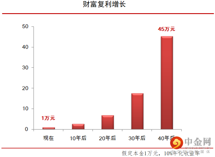 如下图所示,假如我们现在有1万元,在每年10%的投资收益水平下,40年后就是45万元。