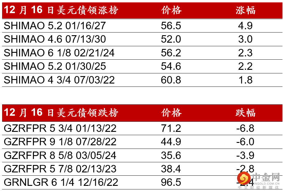 昨日(12月16日),中国高收益债券市场在连跌3天后有所反弹。世茂在国通信托澄清和信托贷款展期消息传出后反弹继续上涨约2-3pts,境内债券亦有小幅反弹。基准债券如融创在午前也有3-4pts的涨幅,但下午大部分涨幅回吐,回到周三收市水平或小幅上涨0.5pt。富力在公布展期方案后,昨日22年债券再下跌约2pts。碧桂园在成功发行10亿人民币境内债后上涨约1pt左右。