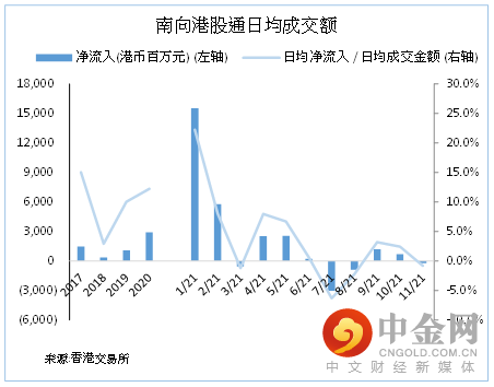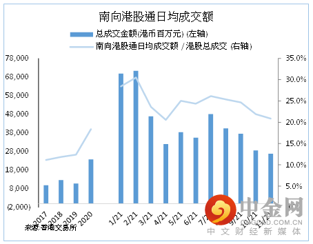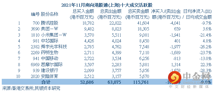 港股通(沪港通及深港通)南下买卖港股可参考附表。沪港通及深港通南下买卖港股十大成交活跃股合计成交于2021年8-10月份连续三个月份出现显着差别后(前者连续三个月份录得净流出,但后者连续三个月录得净流入),11月份两者总体表现趋于一致及均录得净流出。