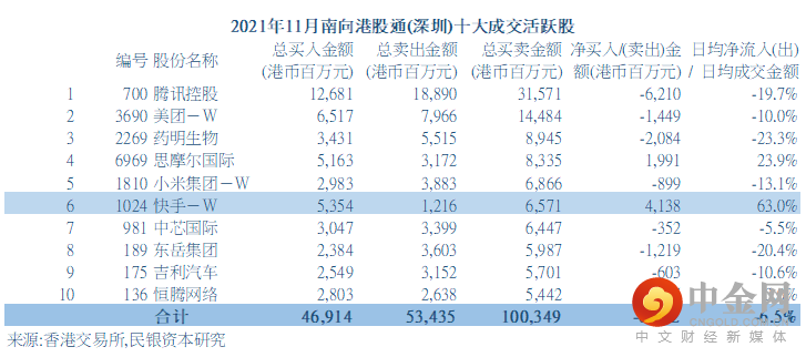 事实上,11月份沪港通及深港通南下买卖港股十大成交活跃股当中,均录得7只股票净流出。另一方面,11月份沪港通及深港通南下买卖港股十大成交活跃股之中日均净流出/日均成交金额比例分别为-9.0%及-6.5%,显示后者沽售比例较低, 主要反映其于个别股票录得较大额净流入, 如快手-W(1024 HK)。