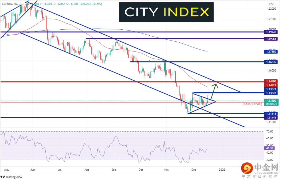 5月26日以来欧元/美元一直交投于长期下降通道内,11月26日止步于最新低点1.1186。欧元/美元之后回到区间内,目前徘徊于一个对称三角形内。价格突破通道一边失败后往往走向通道的另一边。欧元/美元之前下破通道失败,所以后市可能上攻下降通道的上轨趋势线,即1.1490附近。