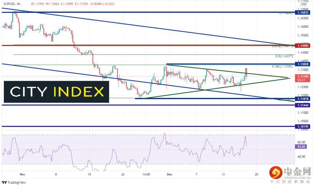 在通道上轨趋势线目标之下还有多个重要阻力位需要攻克,比如1.1380附近,那是10月28日高点到11月24日低点行情的38.2%回档位,也是水平阻力位所在。还有上方的1.1438,那是前述行情的50%回档位,也是50天均线所在。下档第一个支撑在短期三角形下轨趋势线所在的1.1262附近,然后为周三低点1.1222。如果下破之,可能跌至11月24日低点1.1144、长期水平支撑位1.1020。