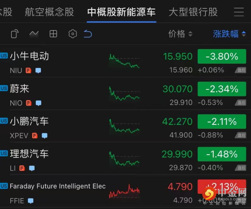 中概股新能源车普跌。理想汽车跌近1.5%,小鹏汽车跌2.11%,蔚来跌2.34%,小牛电动跌3.80%,法拉第涨2.18%。