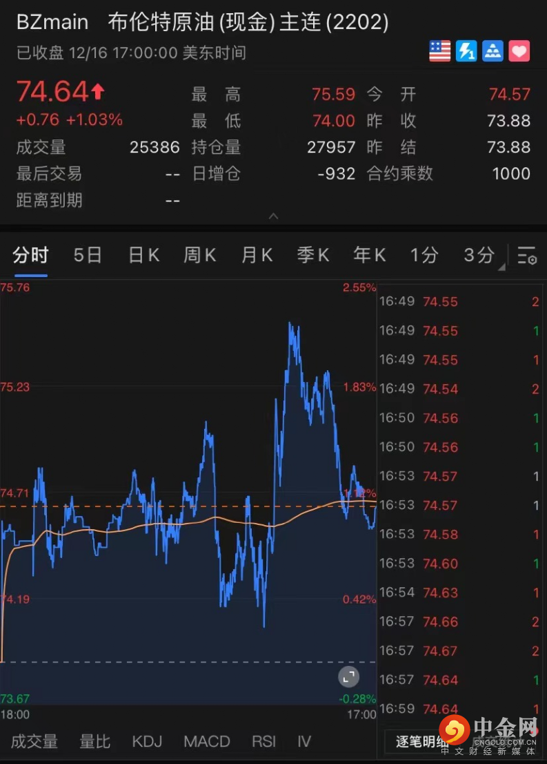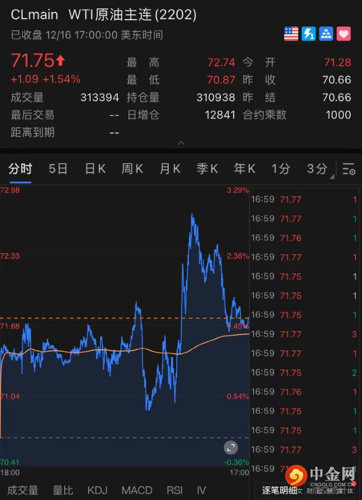 美油创三周新高。WTI 原油期货收涨1.09美元,涨幅1.54%,报71.75美元/桶。布伦特原油收涨1.03美元,涨幅0.76%,报74.64美元/桶。