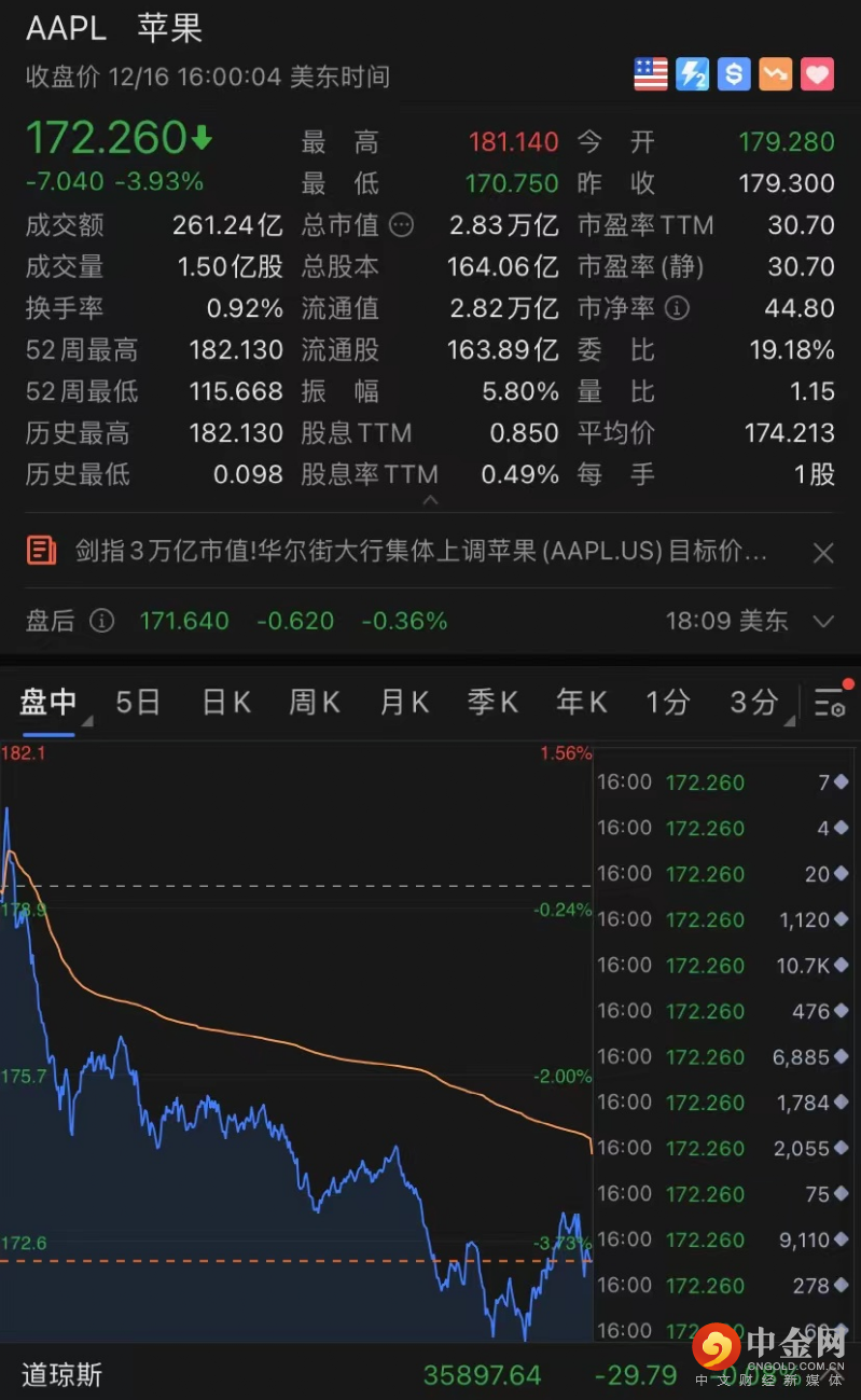 苹果报收172.26美元/股,跌3.93%,总市值2.83万亿美元。