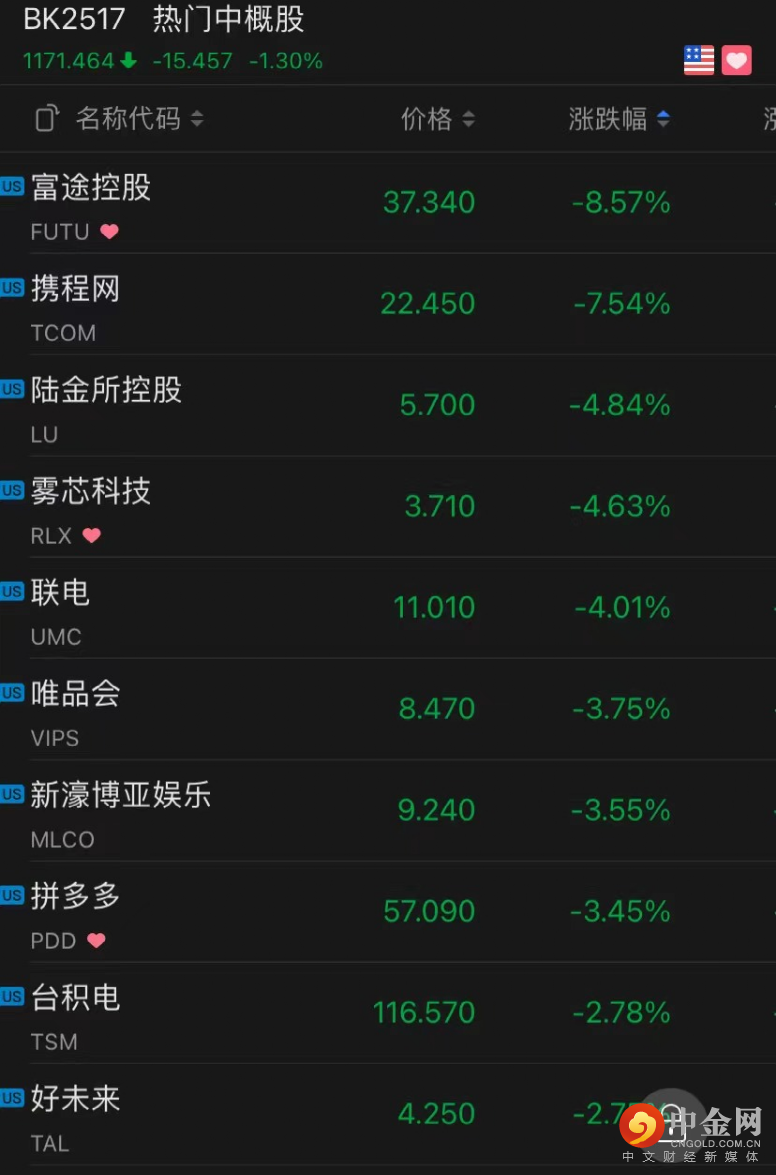 热门中概股方面,腾讯、京东、知乎跌超1.3%,雾芯科技、蘑菇街跌超4.6%,叮咚买菜跌超6.6%,携程跌超7.5%,老虎证券跌约8.3%,富途控股跌超8.5%。