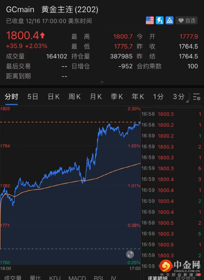 黄金收涨2.03%至1800.4美元/盎司,创两月最大涨幅及逾三周新高。