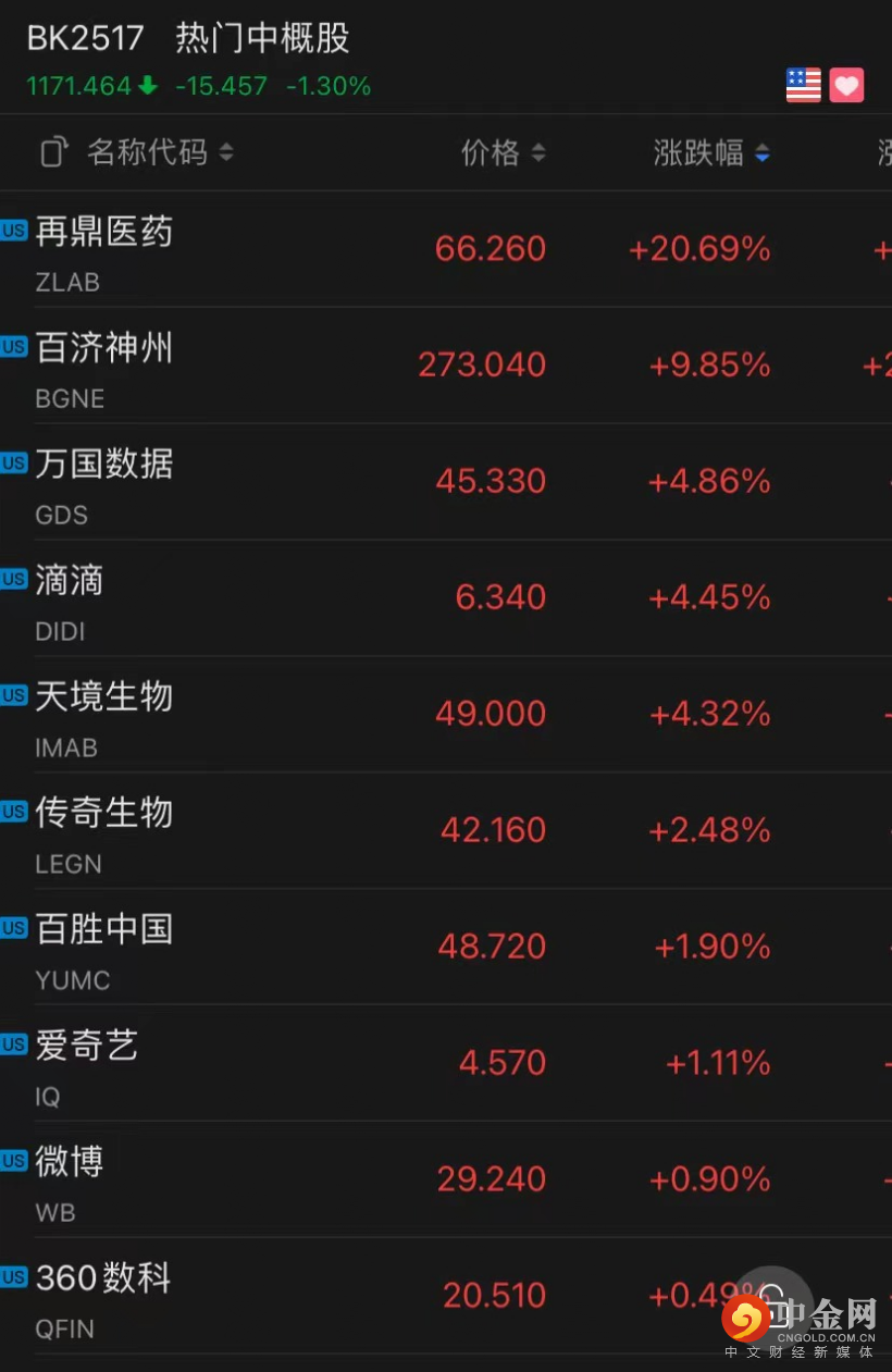 再鼎医药涨近21%,百济神州涨超9.8%,趣头条涨超9.3%,第九城市涨超3.3%,房天下涨超3.2%,流利说、小赢科技涨超1.2%,爱奇艺涨超1.1%。