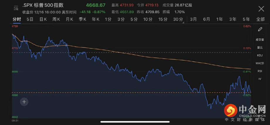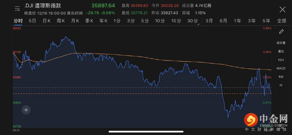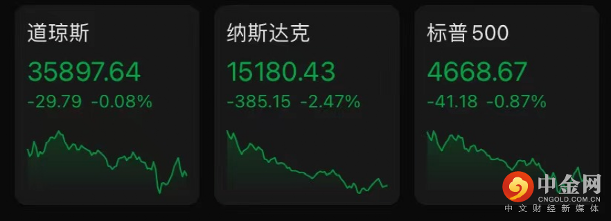 道琼斯工业平均指数收跌29.79点,跌幅0.08%,报35897.64点,回吐周三涨超380点的小部分收盘涨幅。纳斯达克数指收跌2.47%,报15180.43点,创今年5月12日以来最大收盘跌幅,并创12月3日以来收盘新低。标普500收跌0.87%,报4668.67点,回吐周三约半数涨幅。