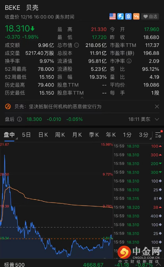 贝壳股价全日巨震:在浑水造假指责下盘前跌10%,贝壳随后的回应痛击令股价拉升,转为上涨14%,但此后股价再度回落。周四当日美股大盘也表现低迷,纳斯达克100盘中大跌超2%。收盘报18.31美元,跌1.98%,总市值218.05亿美元。