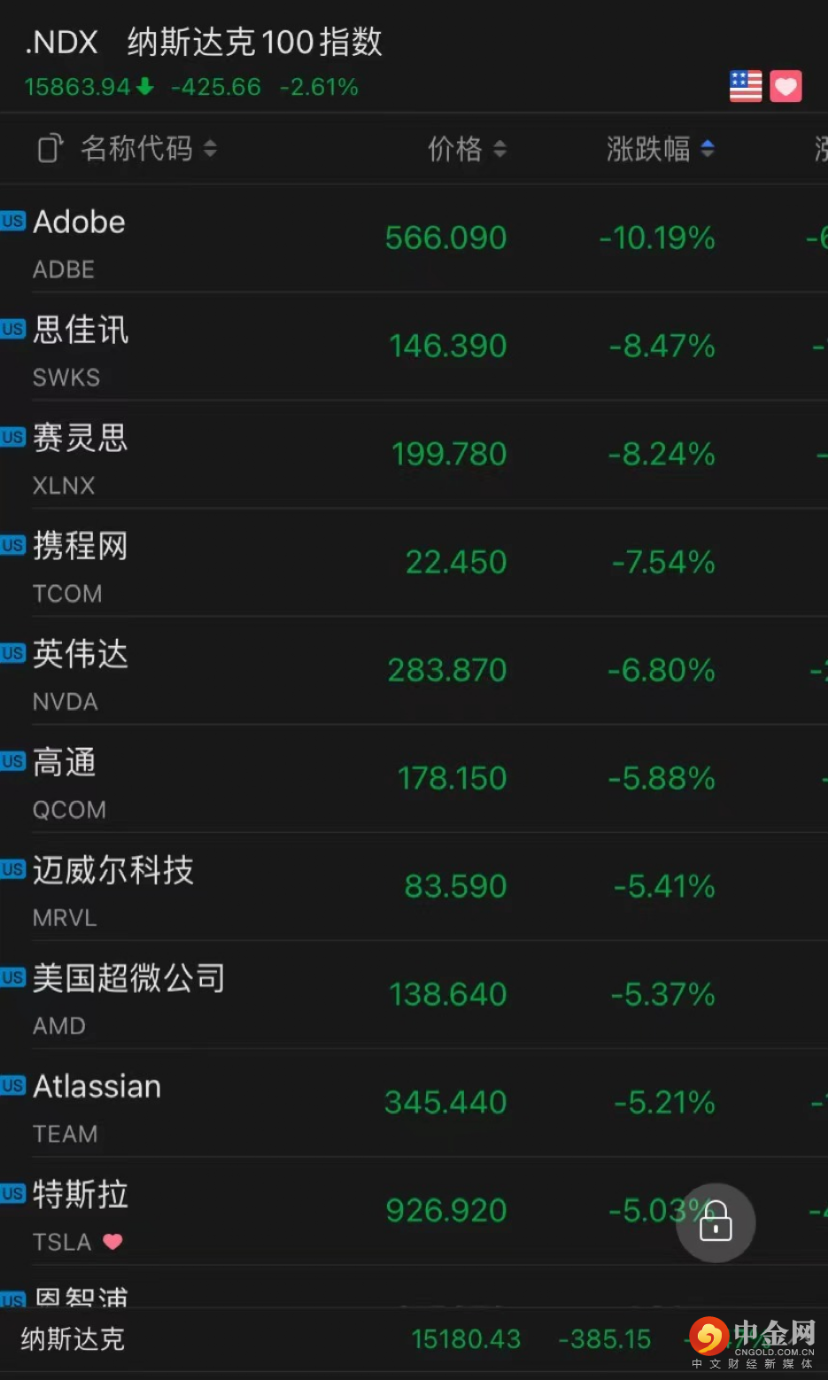 纳斯达克100指数收跌逾2.6%,成分股Adobe跌近10.2%领跌,思佳讯跌近8.5%,赛灵思跌超8.2%,携程跌7.54%,英伟达跌6.8%,特斯拉跌超5.0%,苹果跌超3.9%,微软跌近3%。