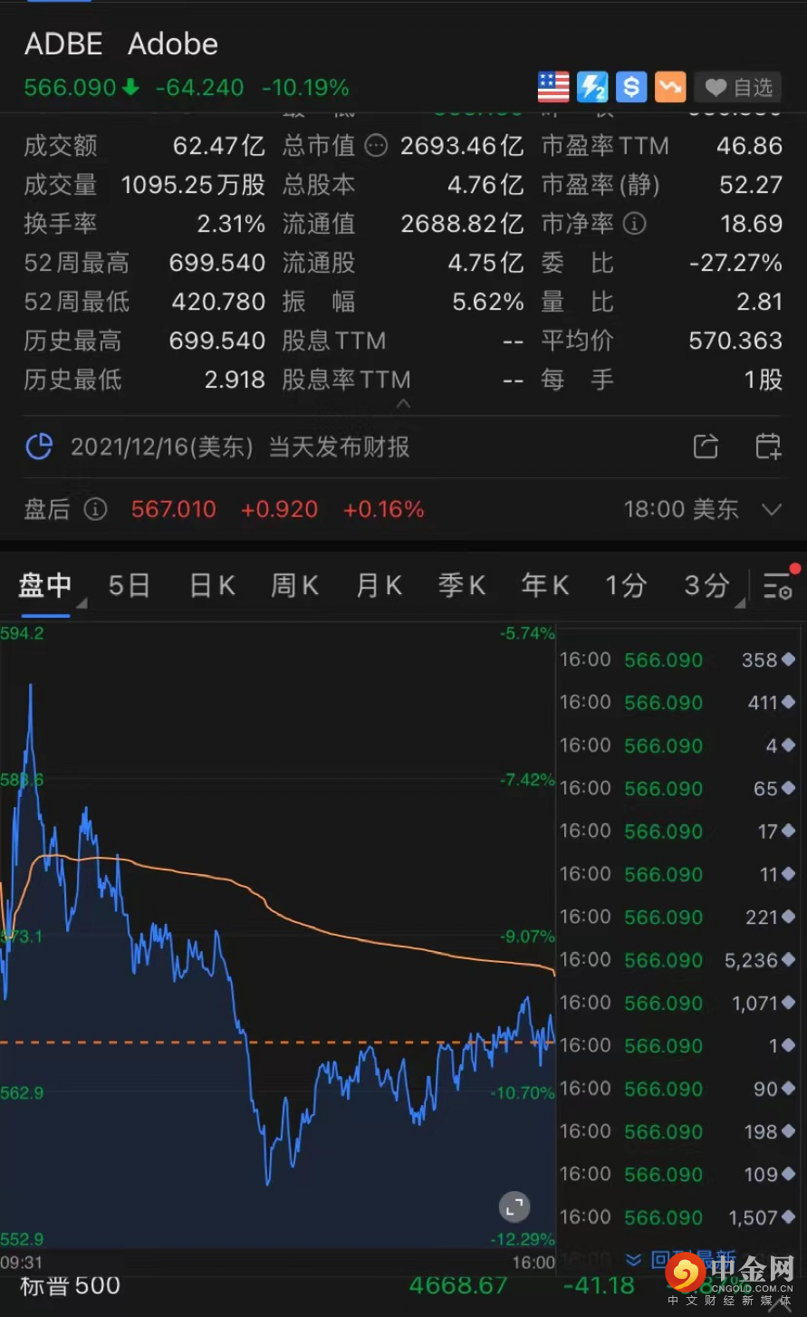 美股软件巨头Adobe发布截至12月3日的2021财年四季报,虽然财报本身创出营收新高,但逊于预期的前瞻指引再度引发了投资者抛售,截至收盘股价跌10.19%,创21个月来最差表现,报收566.09美元/股,总市值2693.36亿美元,比上个交易日跌去近300亿。