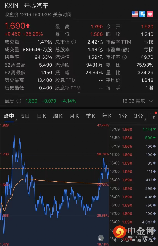 开心汽车暴涨近37%,此前北京步甲国际物流同意在未来5年内向该公司订购至少1万辆新能源卡车,意向订单总金额在5亿美元以上。收盘报1.69美元,市值2.42亿美元。