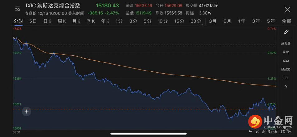 美三大股指高开低走,收盘全线收跌,纳指跌近2.5%创7个月最大跌幅。