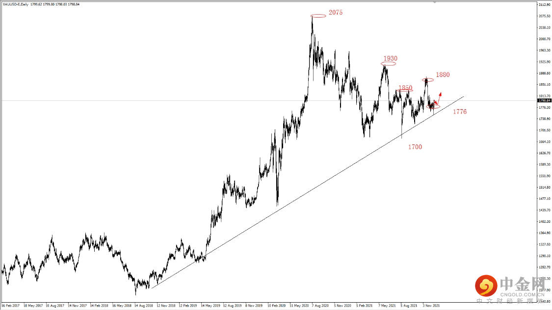 日线图来看,黄金依然处于上涨趋势线之上,在周三触及趋势线切上行,未来行情依然偏多。