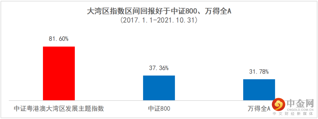当地优势产业主要集中于“先进制造”、“半导体通信”、“新能源”、“现代服务”、“品牌消费”等中国重点发展领域。作为经济的晴雨表,区域指数表现突出,2017年1月1日至2021年10月31日,中证粤港澳大湾区发展主题指数累计涨幅81.6%,明显跑赢中证800、万得全A指数。