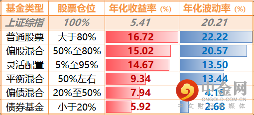 我们再来看基金指数的情况,不同基金分类约定的股票仓位变化有何影响?股票指数是100%仓位的股票资产,普通股票型基金则以80%以上的股票仓位、10年来博得16.72%的年化收益率+22.22%的年化波动率!下表一目了然:随着股票仓位的逐渐降低,不同类型基金的收益、波动水平明显呈阶梯式递减。到股票仓位低于20%的债券型基金,年化收益与波动率收缩到5.92%+2.68%。值得注意的是,股债仓位约束较低、股票资产自由切换幅度在5%-95%的灵活配置型基金,其年化收益与波动率水平均衡度最高。